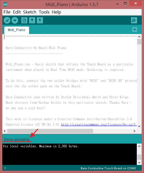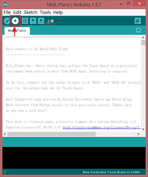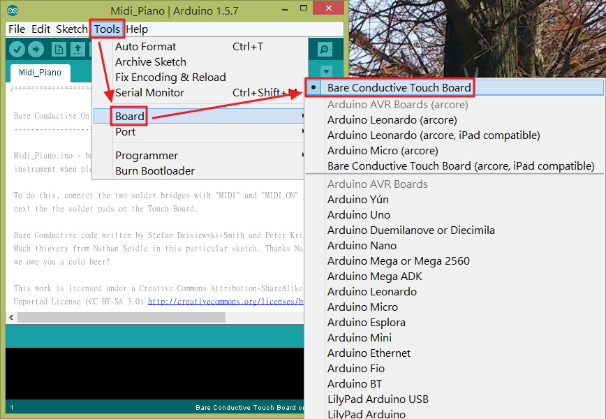板子部分,請從Arduino程式介面的Tools -> Board -> 確認選擇的是Bare Conductive Touch Board