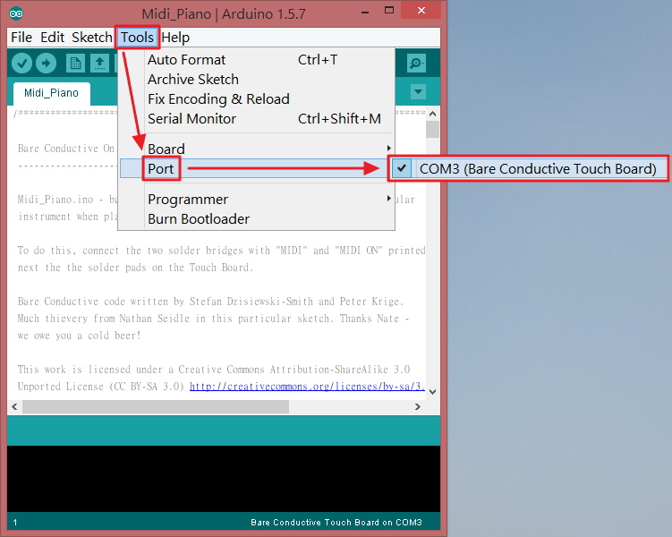 Port部分,請從Arduino程式介面的Tools -> Port -> 選擇適當的port(有標記Bare Conductive Touch Board)的port